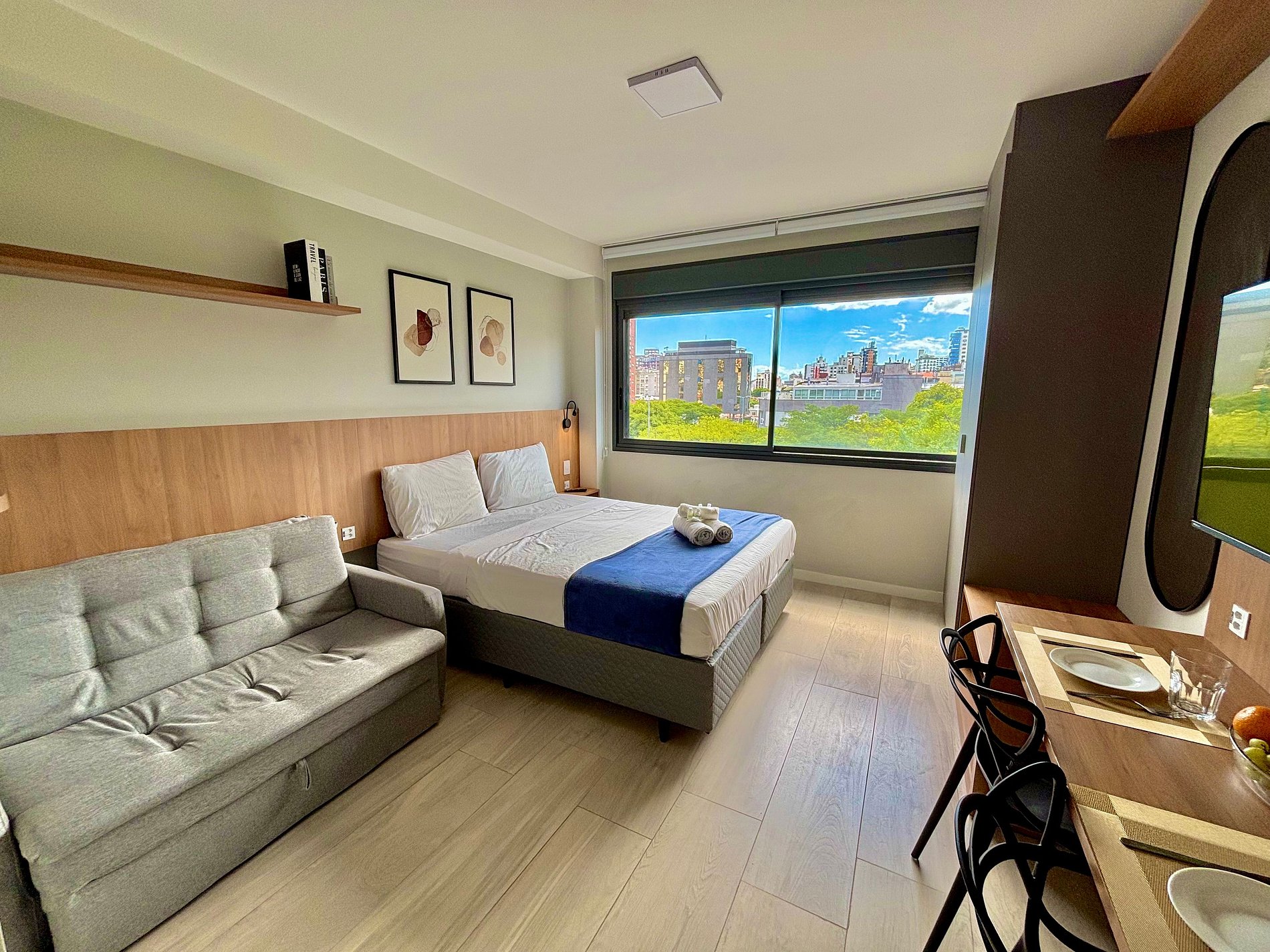 The apartment is extremely cozy, functional, and well equipped, ideal for those seeking comfort and practicality. It features a double bed, a comfortable sofa bed, and a bathroom with an excellent shower. The space is air-conditioned with a split-type air conditioner and offers closets with hangers, as well as a Smart TV and high-speed Wi-Fi — perfect for those who need to work during their stay.