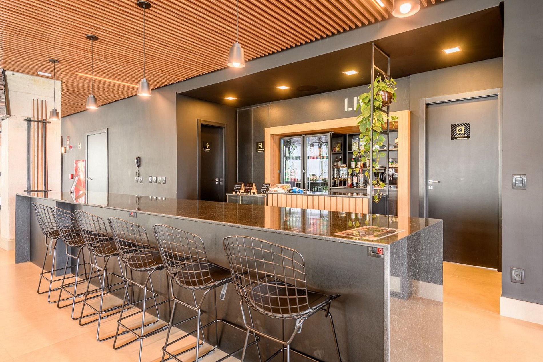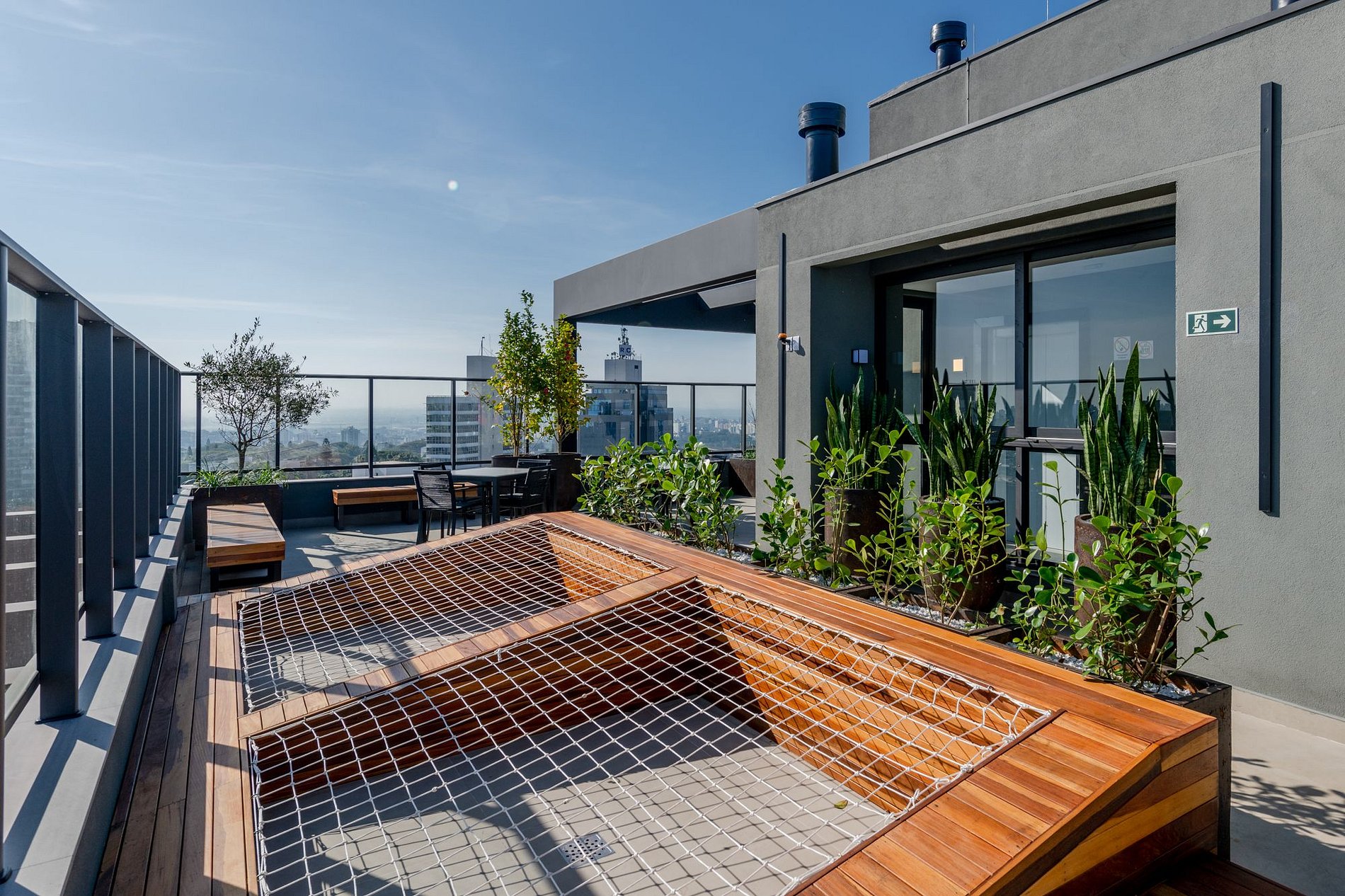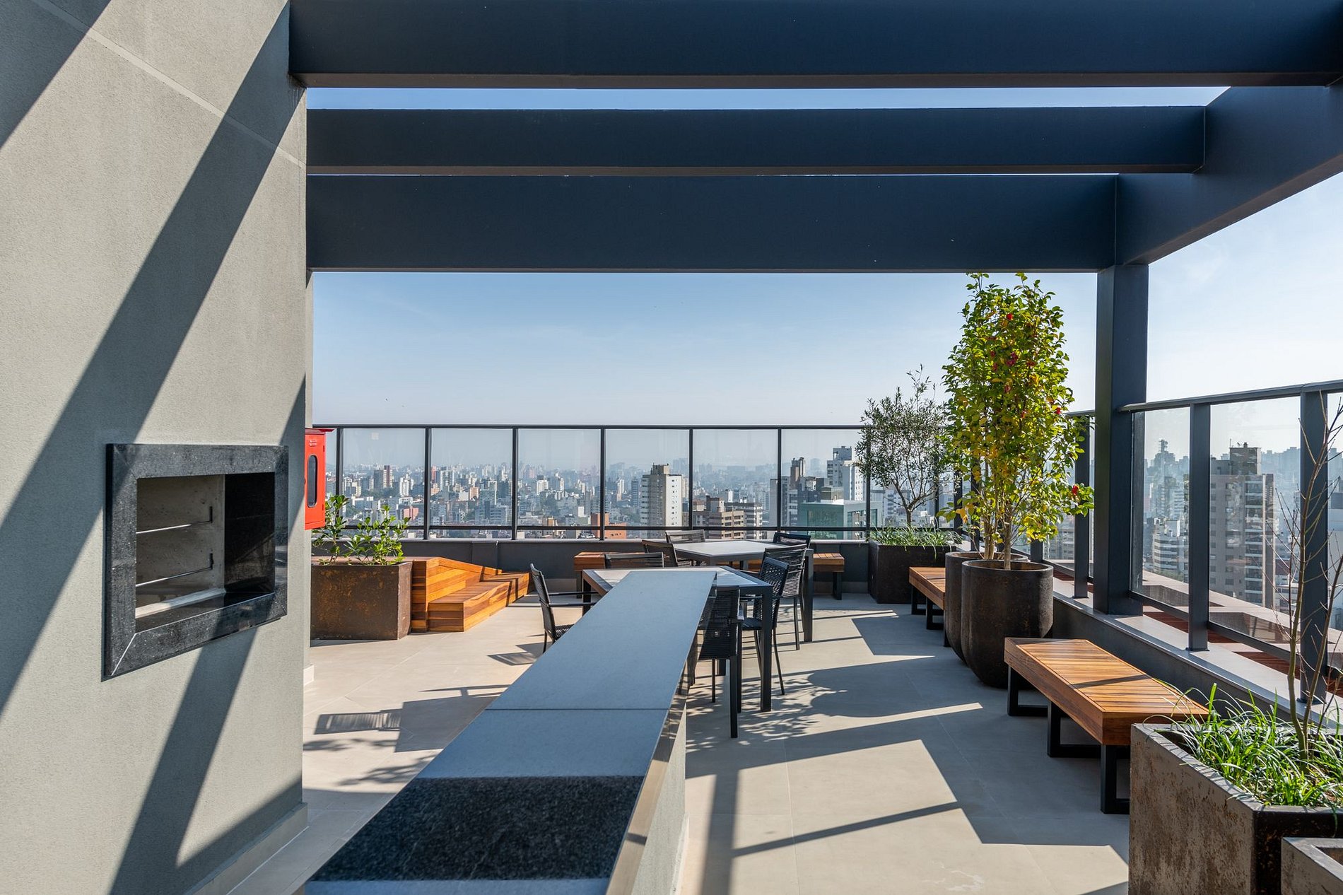 O terraço do LIV oferece uma vista incrível da cidade, piscina com borda infinita, espaço fitness, área gourmet, redário, lavanderia, sala de reunião, coworking, mesa de sinuca, lareira ecológica, balanços confortáveis e cafeteria, além de serviços de hotelaria e portaria 24 horas.