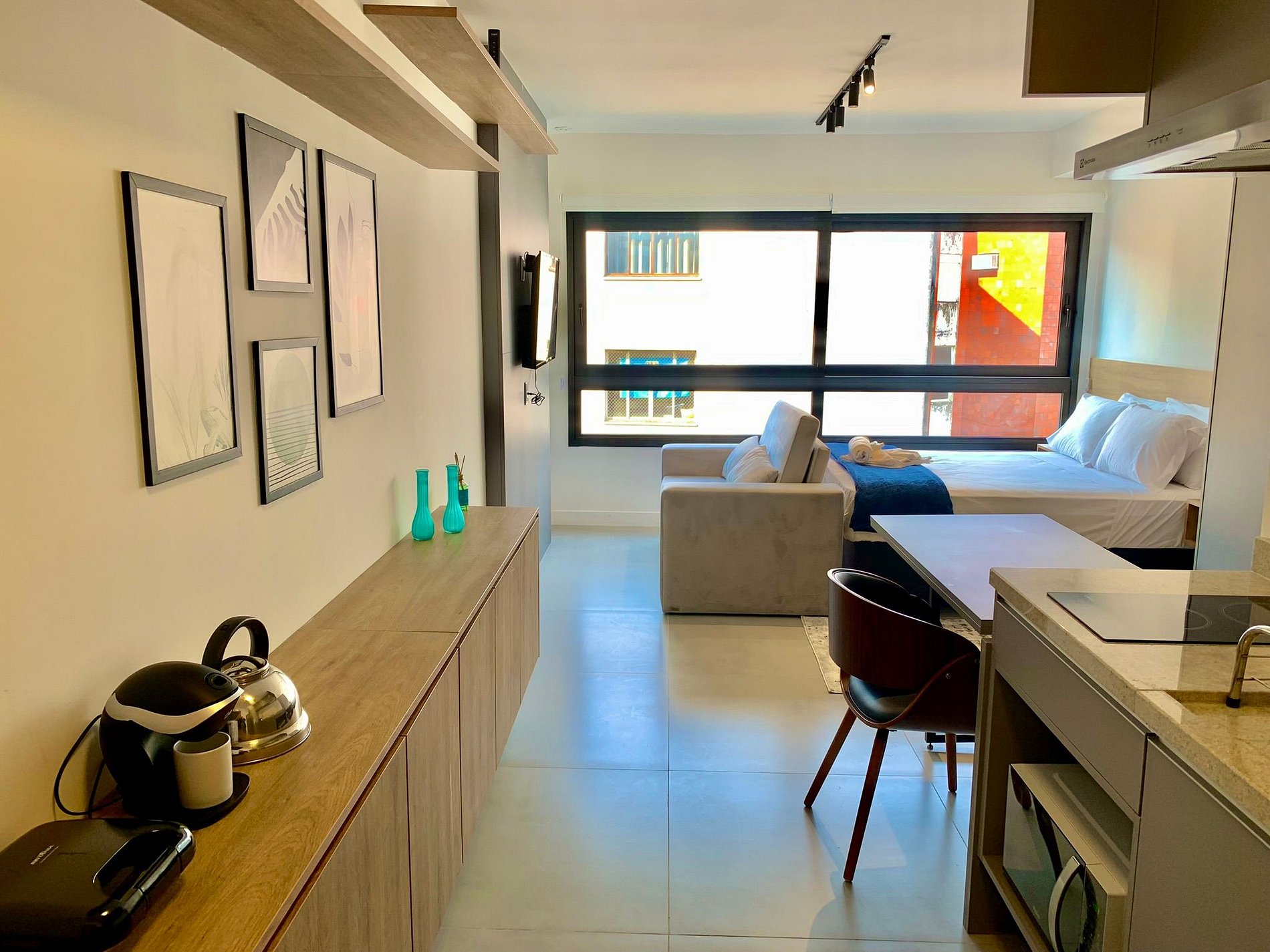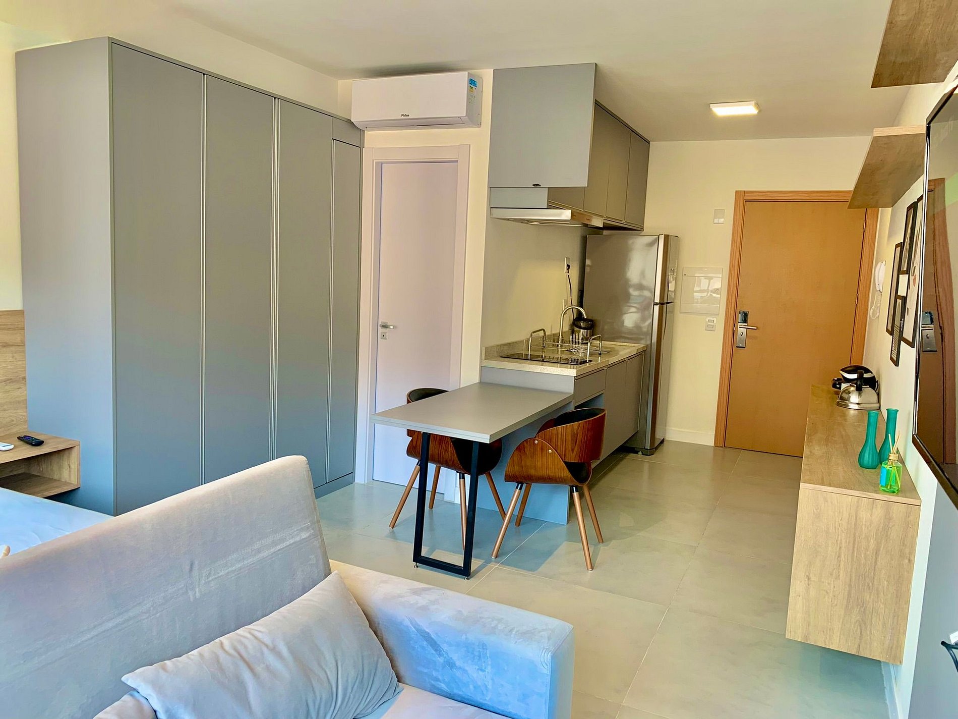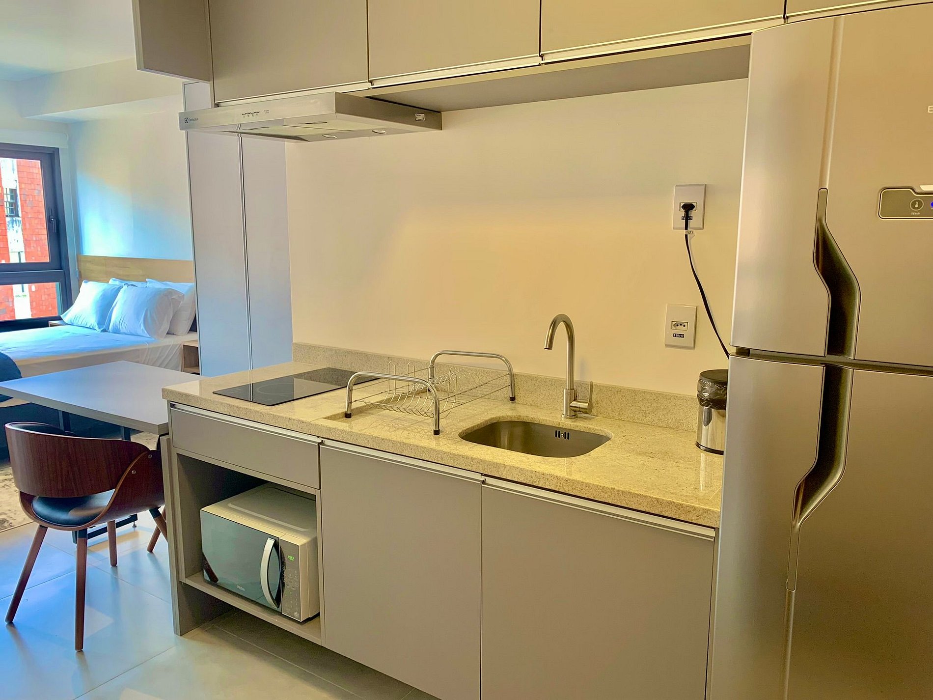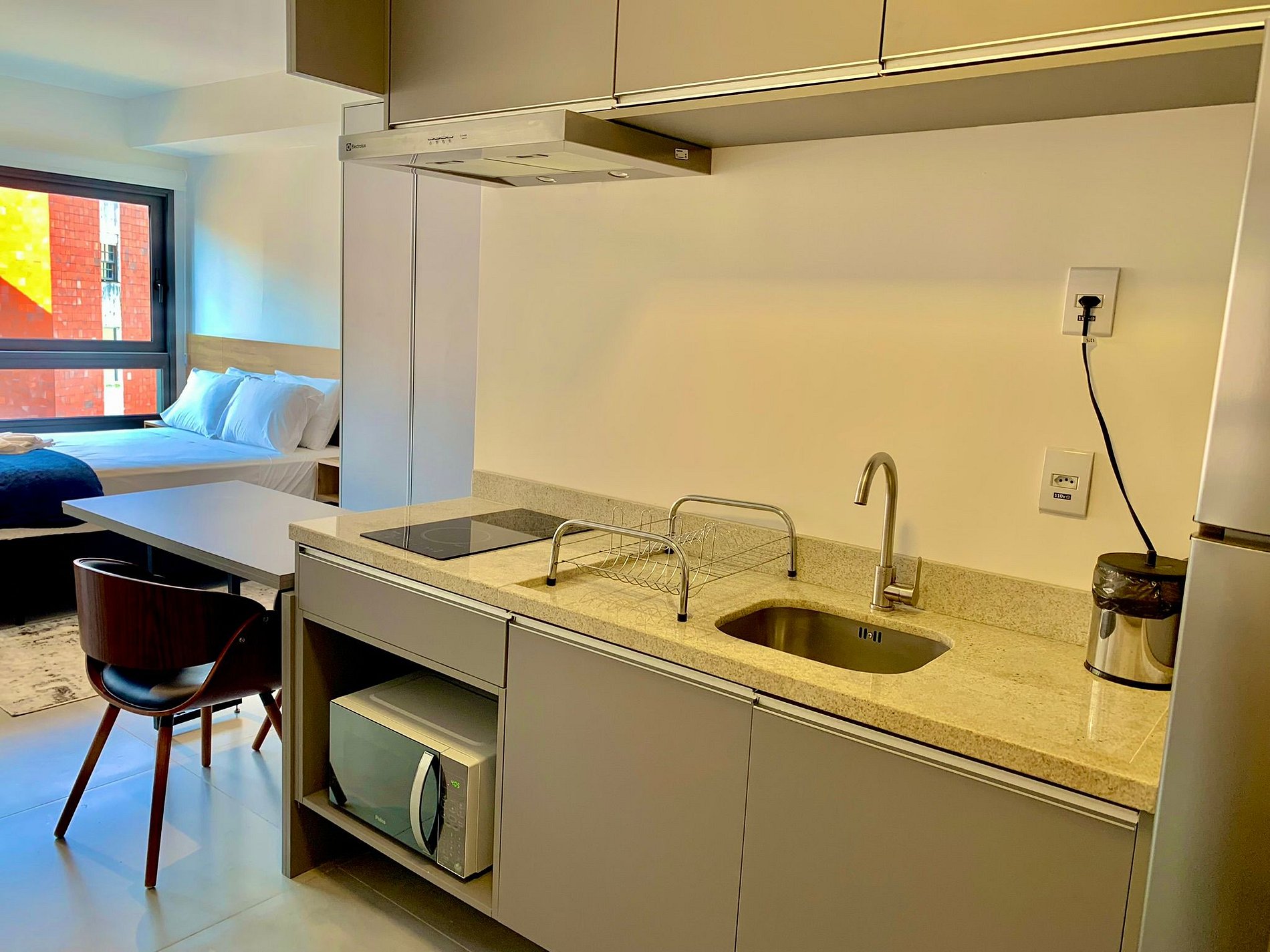 O imóvel é muito aconchegante e funcional. Conta com uma cama de casal, banheiro bem iluminado com chuveiro de ótima qualidade, além de ar-condicionado (split), armários com cabides, Smart TV, Wi-Fi de alta velocidade (ideal para trabalho), e utensílios básicos de cozinha como cafeteira, sanduicheira, chaleira, liquidificador, fogão de indução e micro-ondas. Oferecemos roupa de cama e banho, amenities (shampoo, condicionador e sabonete), secador de cabelo e ferro de passar roupas. O imóvel possui 1 vaga de garagem coberta.