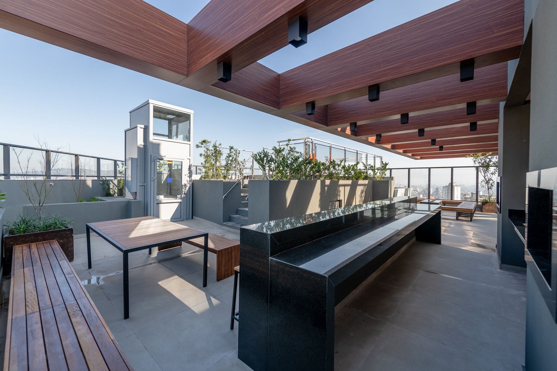 O terraço do LIV conta com vista de tirar o fôlego para toda a cidade, dispõe também de piscina externa com borda infinita, espaço fitness, espaço gourmet, redário, lavanderia, sala de reunião, coworking , mesa de sinuca, lareira ecológica e balanços super confortáveis e uma cafeteria a sua disposição, além de serviços de hotelaria e portaria 24h.