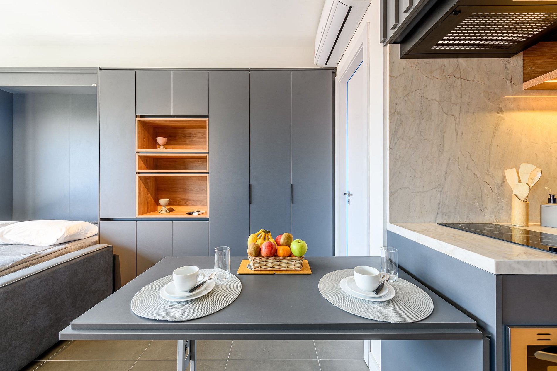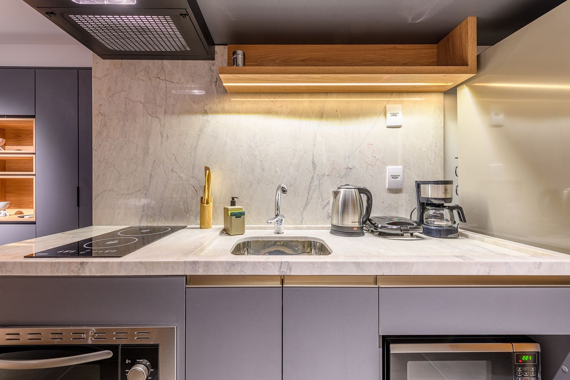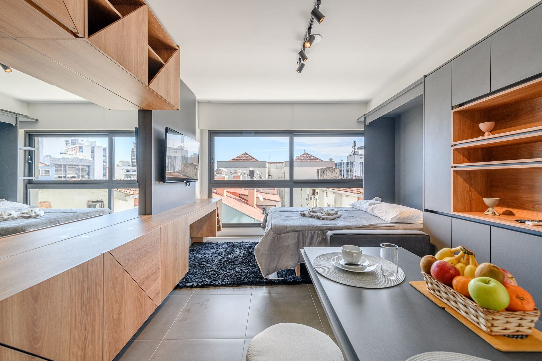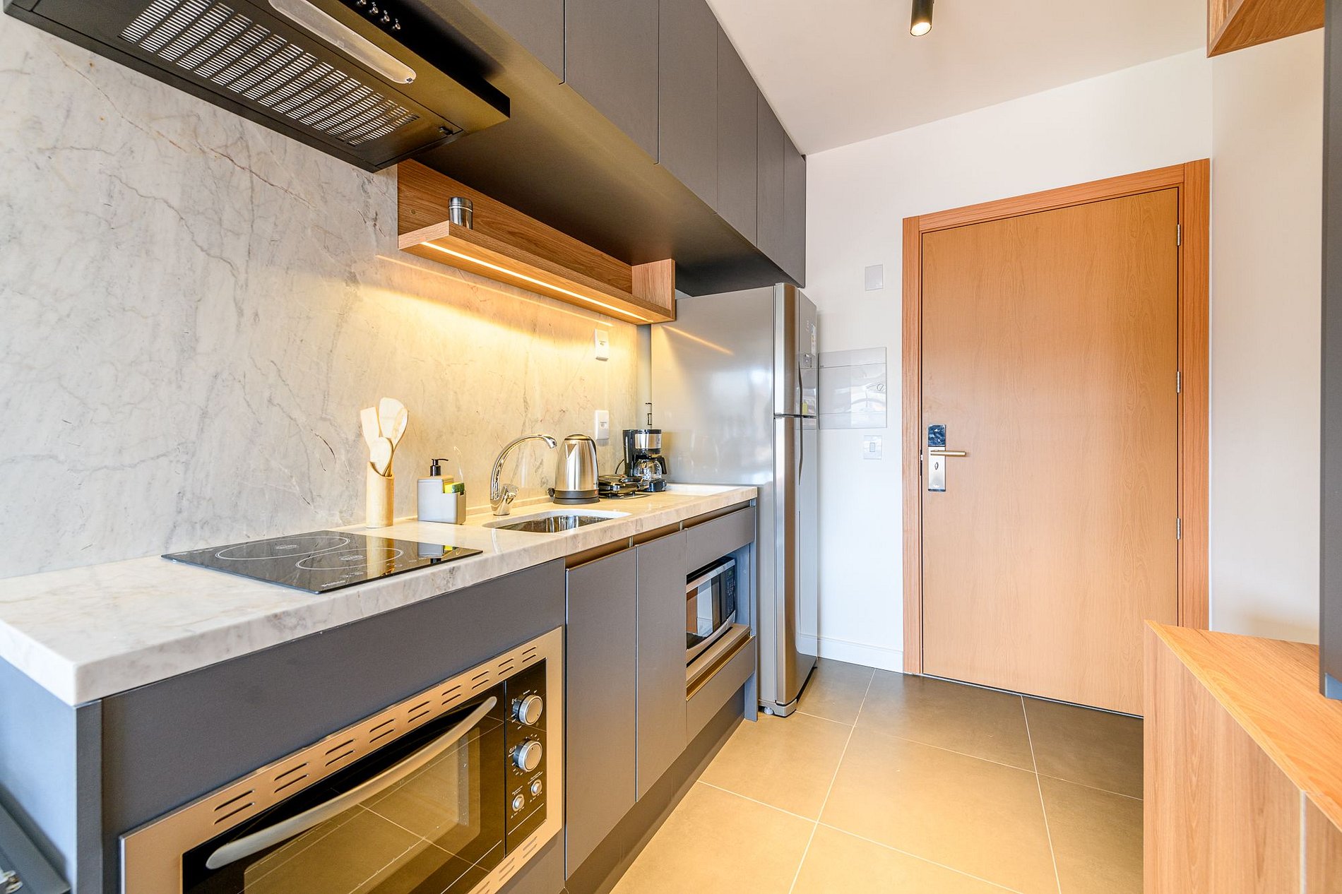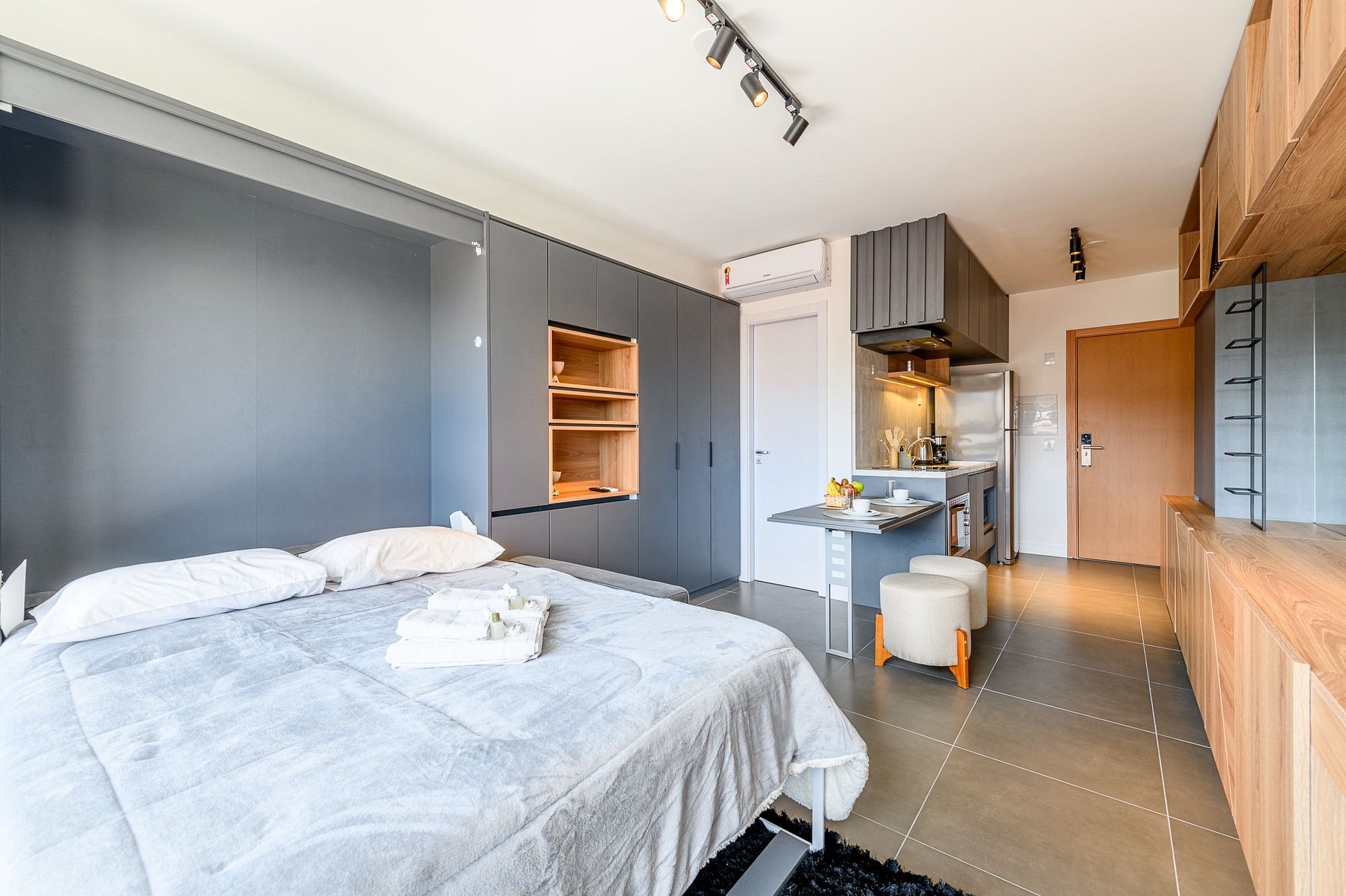 O imóvel é super aconchegante e muito funcional. Possui uma cama de casal, banheiro super bem iluminado com chuveiro excelente. O apartamento ainda conta com ar-condicionado (SPLIT), armários com cabides, SmartTV, WI-FI super rápido (ótimo para trabalhar), utensílios básicos de cozinha incluindo cafeteira, torradeira, mixer, chaleira elétrica, fogão de indução, microondas, também conta com roupa de cama e banho, secador de cabelo, e amenities (shampoo, condicionador e sabonete). Imóvel com 1 vaga de garagem coberta.