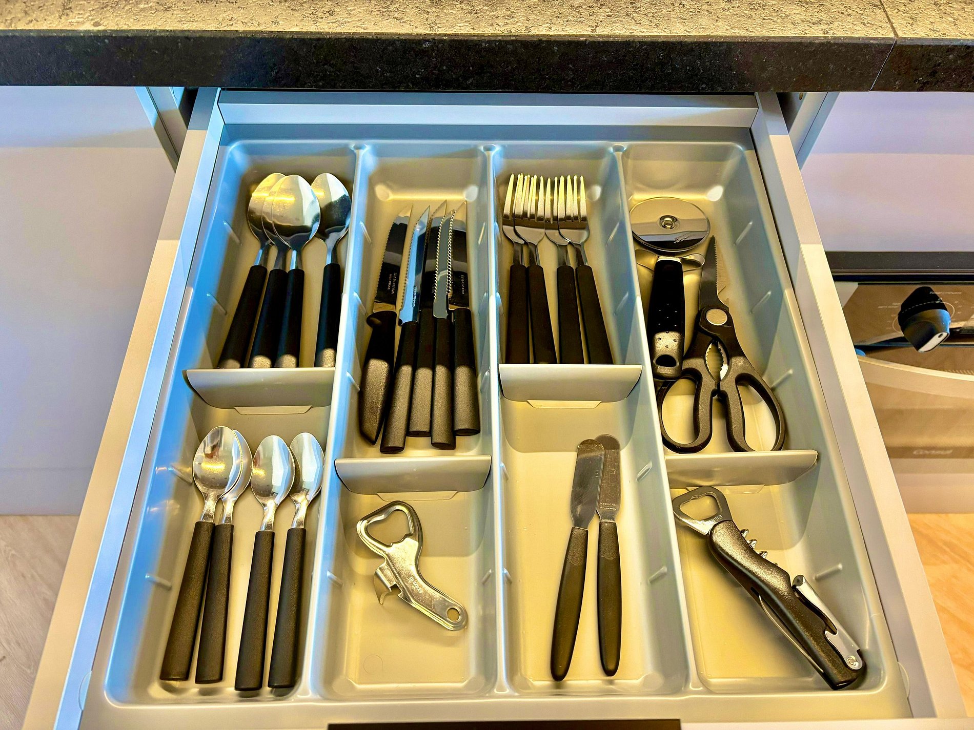La cocina dispone de utensilios básicos y electrodomésticos como cafetera, tostadora, cocina de inducción y microondas. El apartamento también incluye ropa de cama y baño, secador de cabello y amenities (champú, acondicionador y jabón).