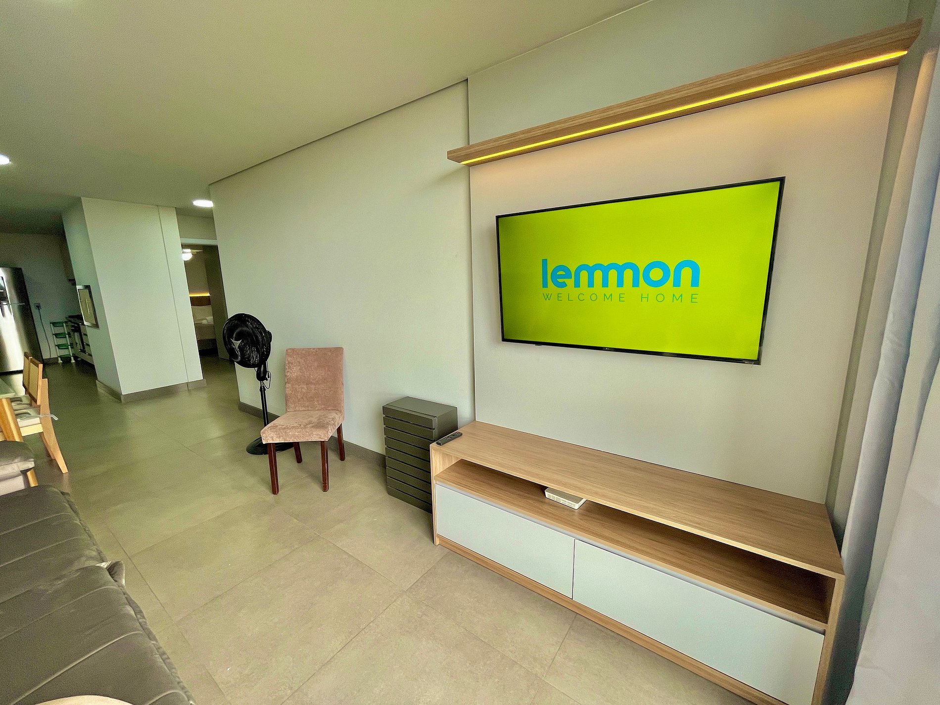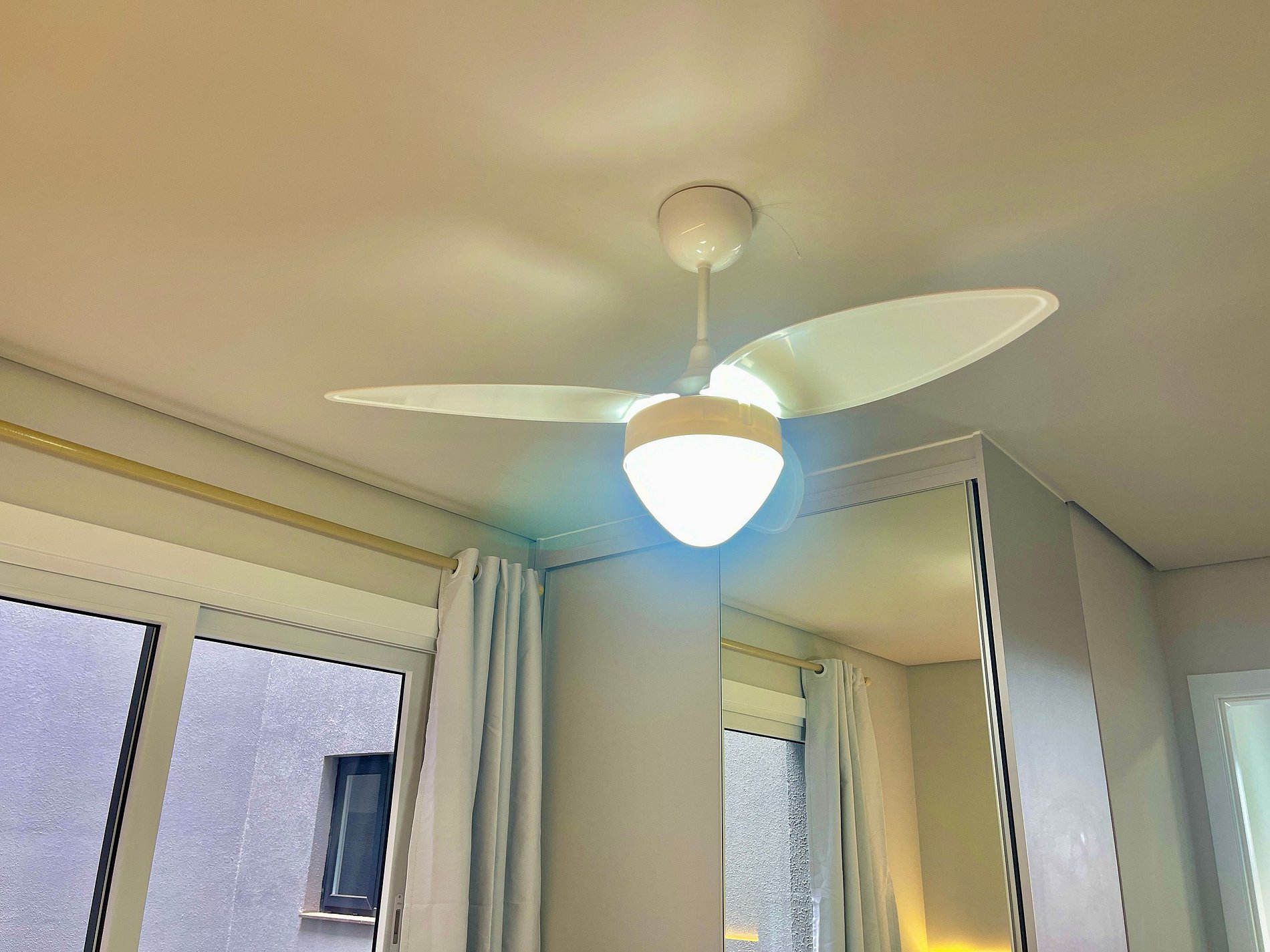 O apartamento conta com ventilador de teto nos dois quartos e na sala.