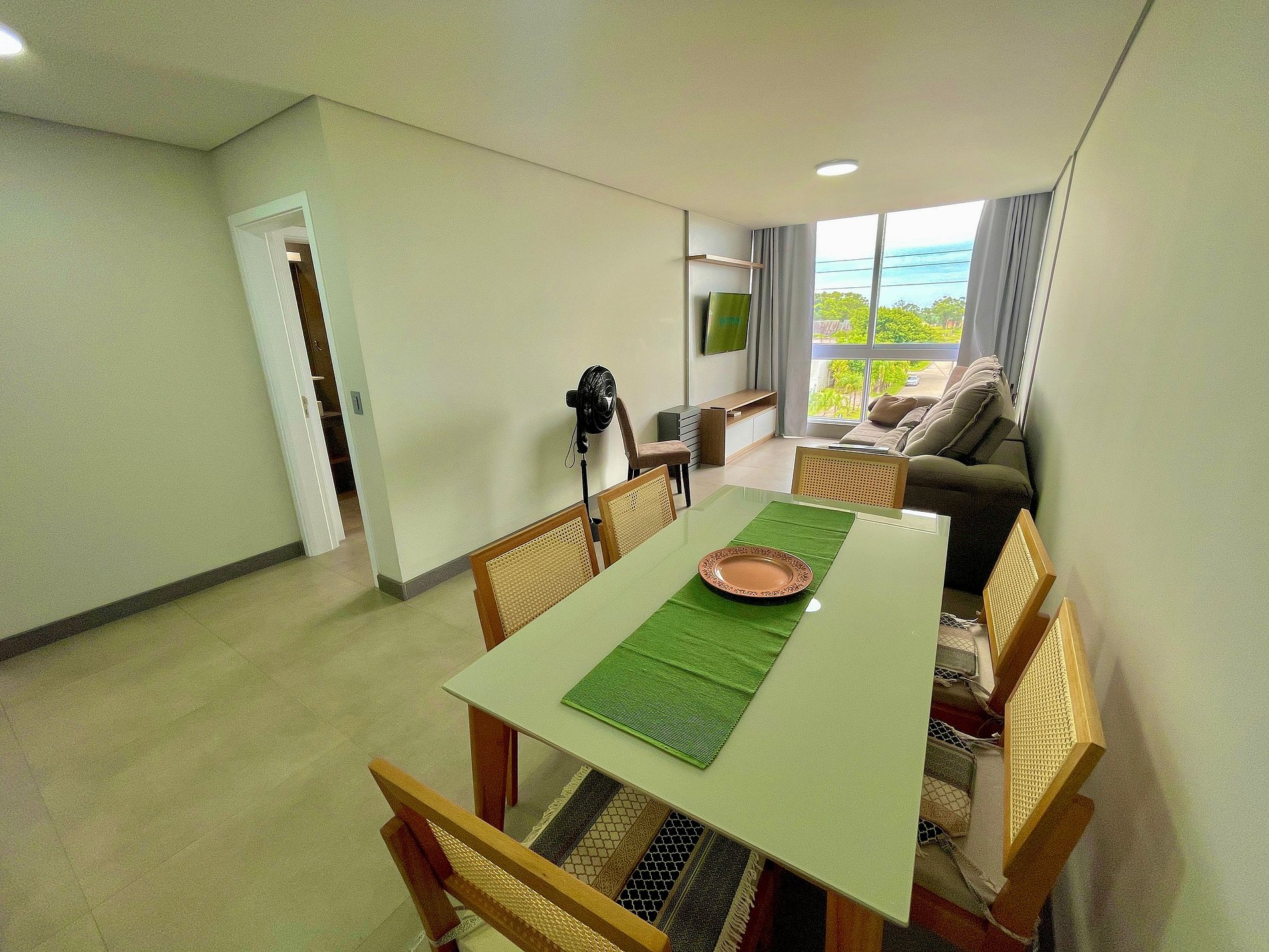 O apartamento conta com ventilador de teto nos dois quartos e na sala.