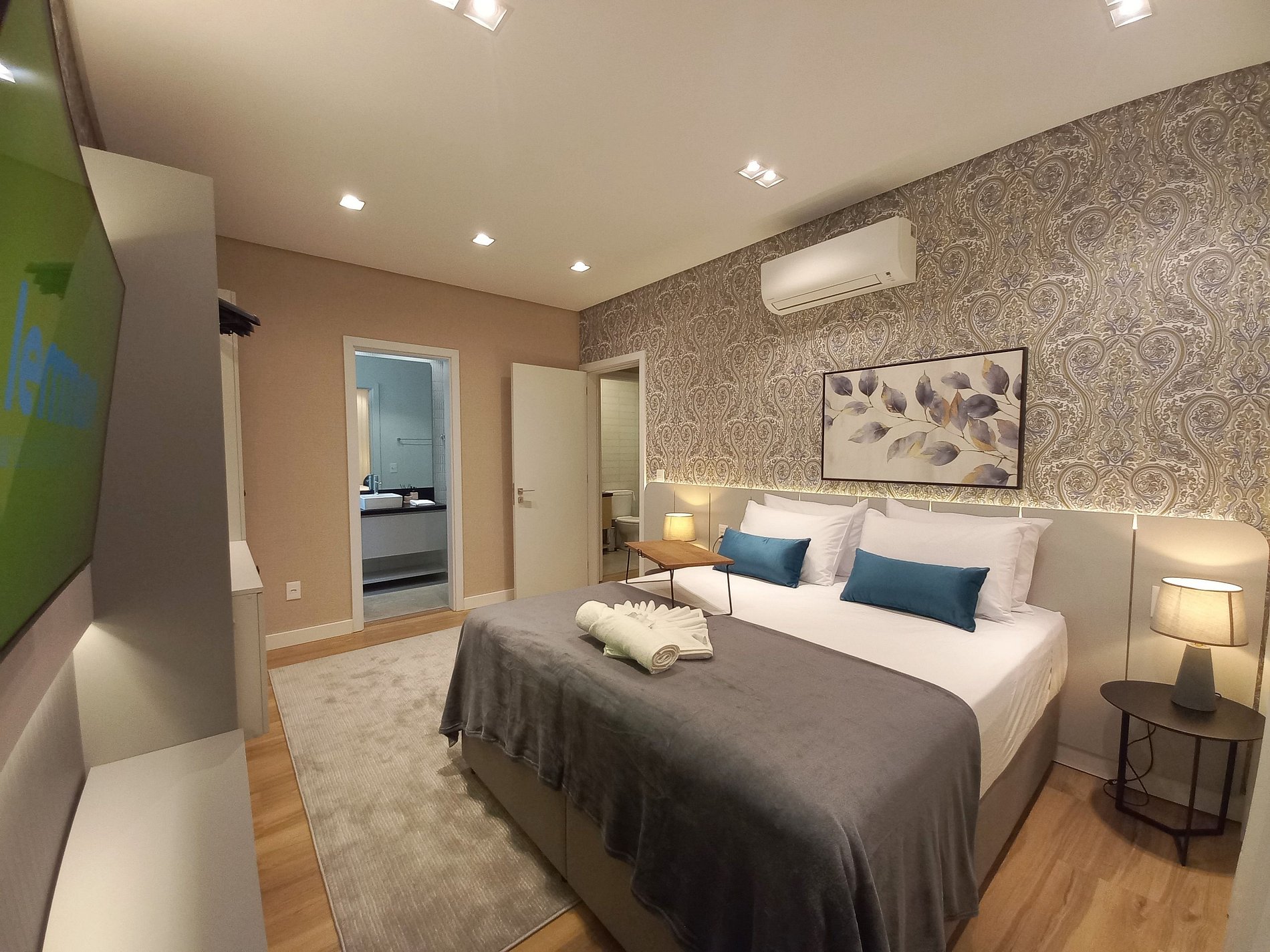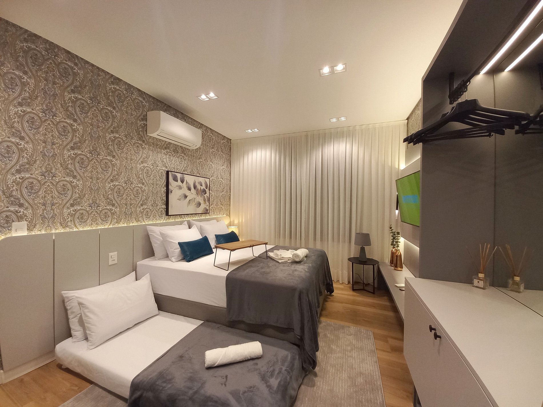 O apartamento é moderno, aconchegante e muito funcional. Possui uma suíte com cama de casal e cama de solteiro auxiliar, um segundo quarto com duas camas de solteiro, além de um confortável sofá-cama na sala, acomodando até 7 pessoas com praticidade.