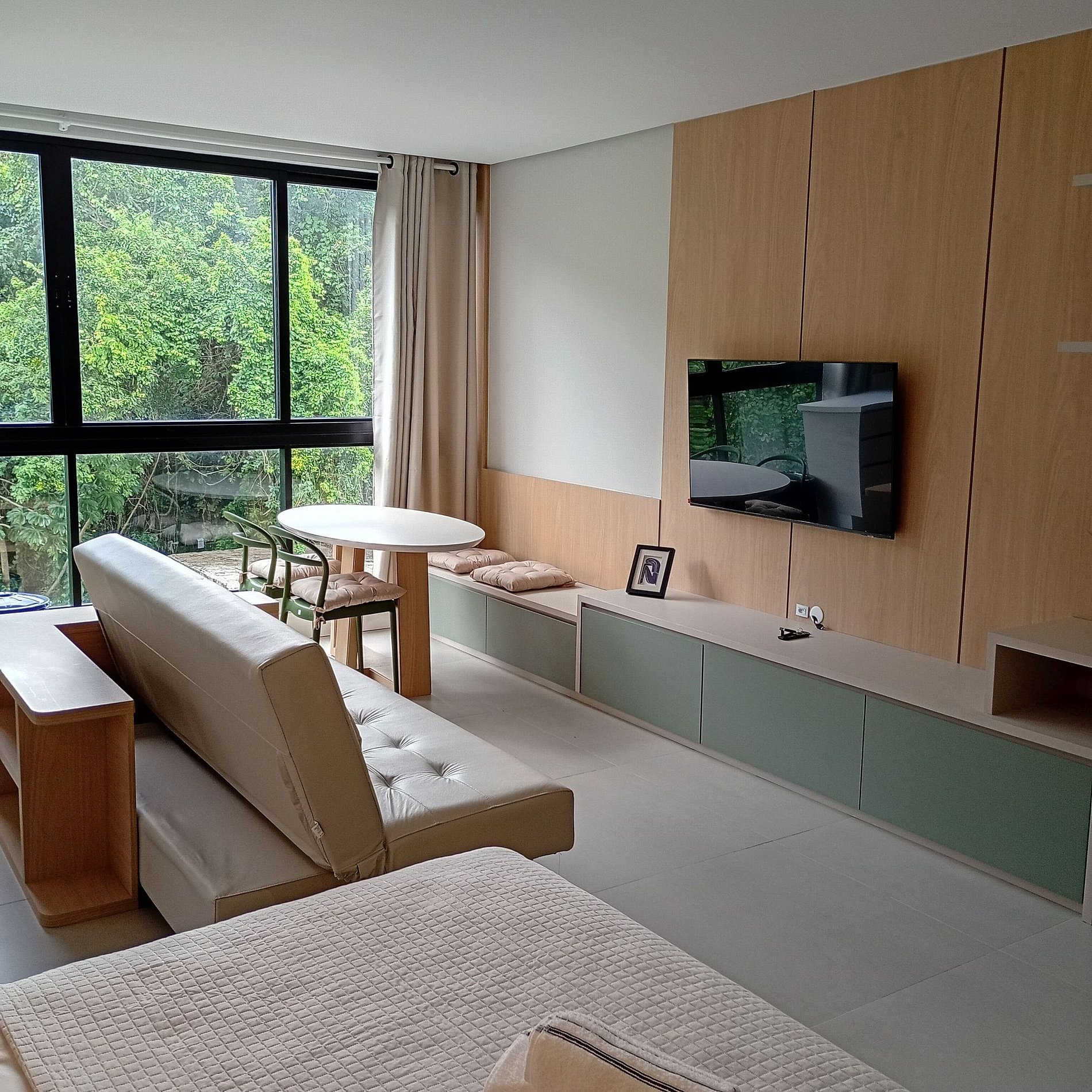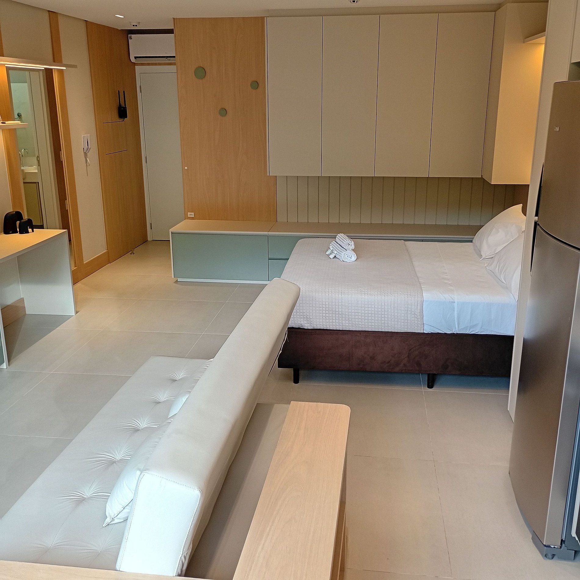 • Estúdio moderno e funcional para até 4 hóspedes, com quarto, sala integrada e cozinha completa — ideal para temporada.