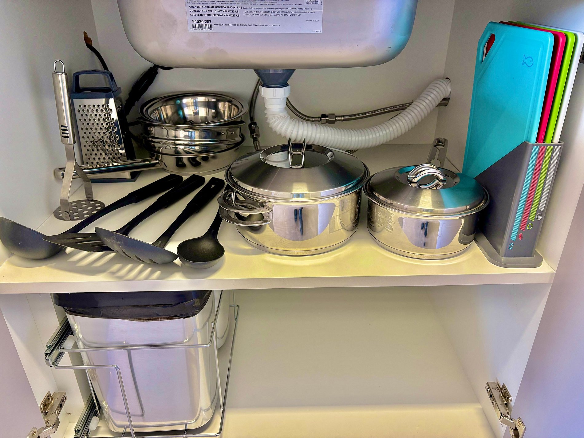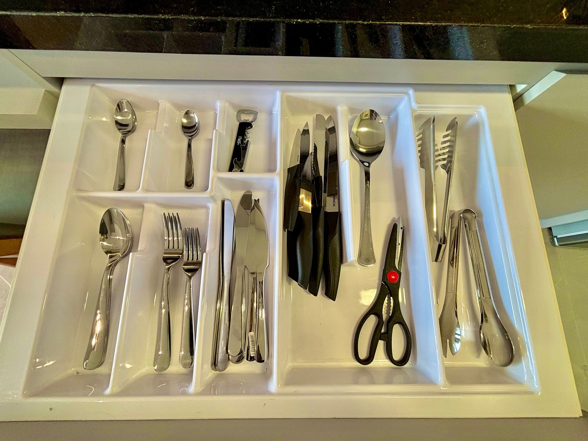 A cozinha dispõe de utensílios básicos e eletrodomésticos como cafeteira, torradeira, liquidificador, fogão de indução e micro-ondas. O apartamento também inclui roupas de cama e banho, secador de cabelo, e amenities (shampoo, condicionador e sabonete).