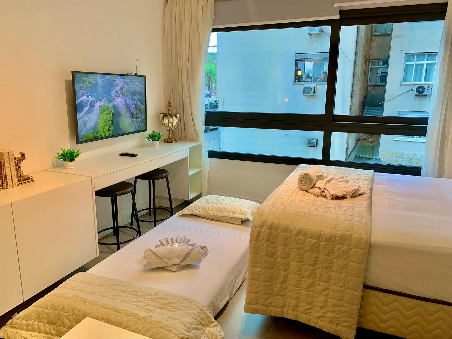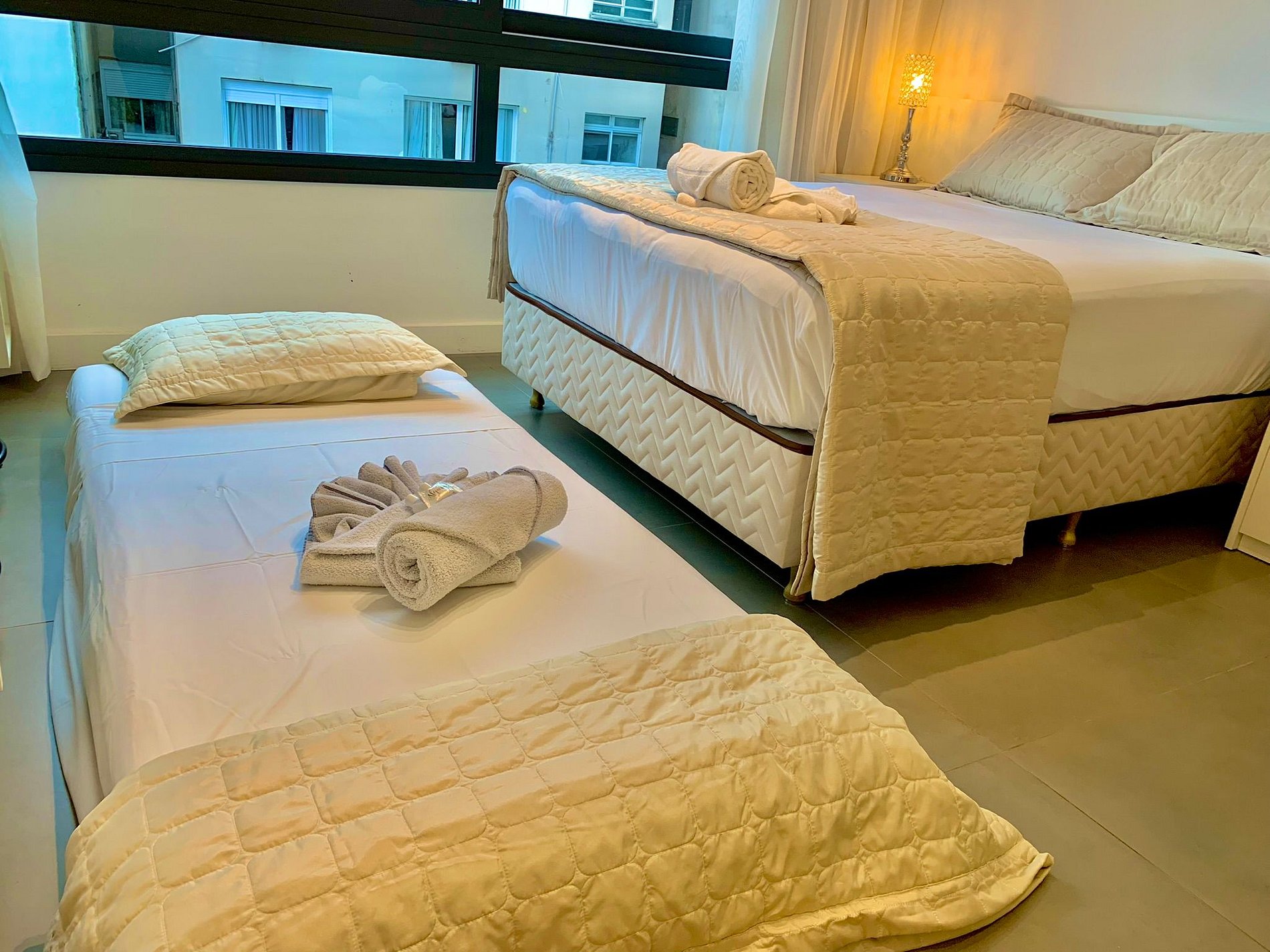 O apartamento conta com uma cama dobrável, que acomoda uma terceira pessoa.