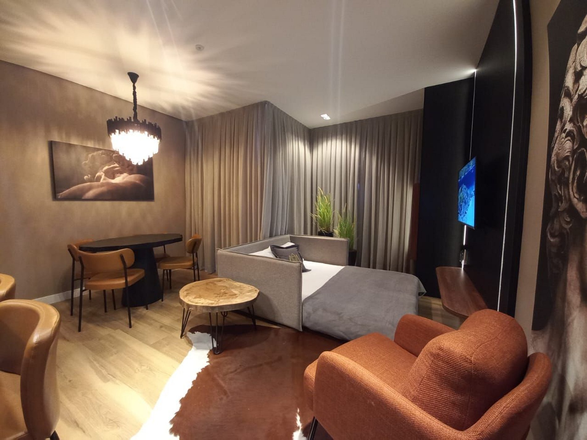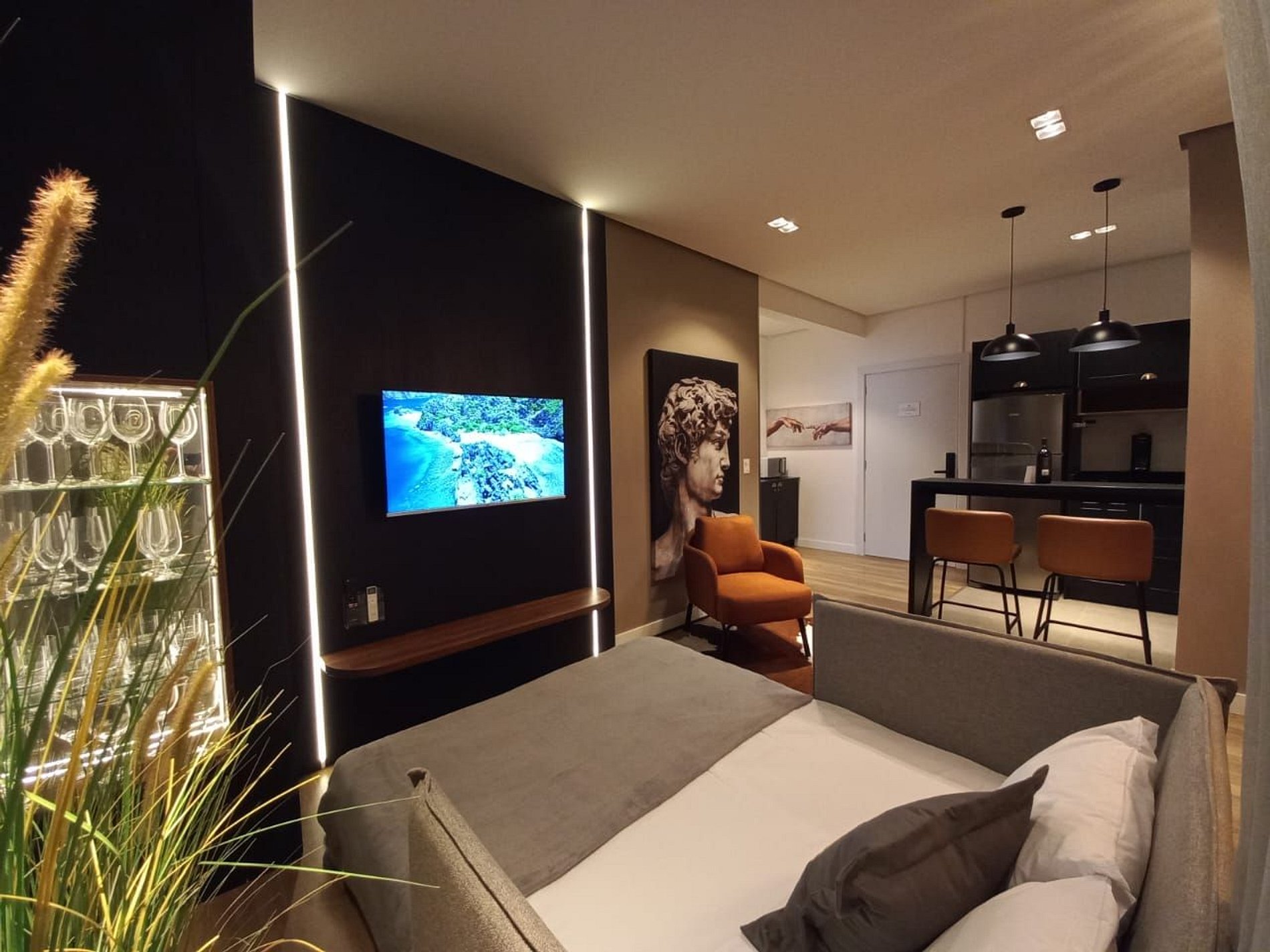 Apartamento de 01 dormitório novinho, completo e perto de tudo. No coração de Gramado. Acomoda até 05 pessoas confortavelmente. o Apartamento conta com ar condicionado no quarto e na sala.