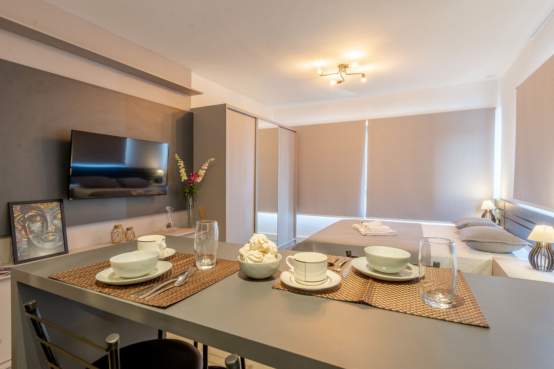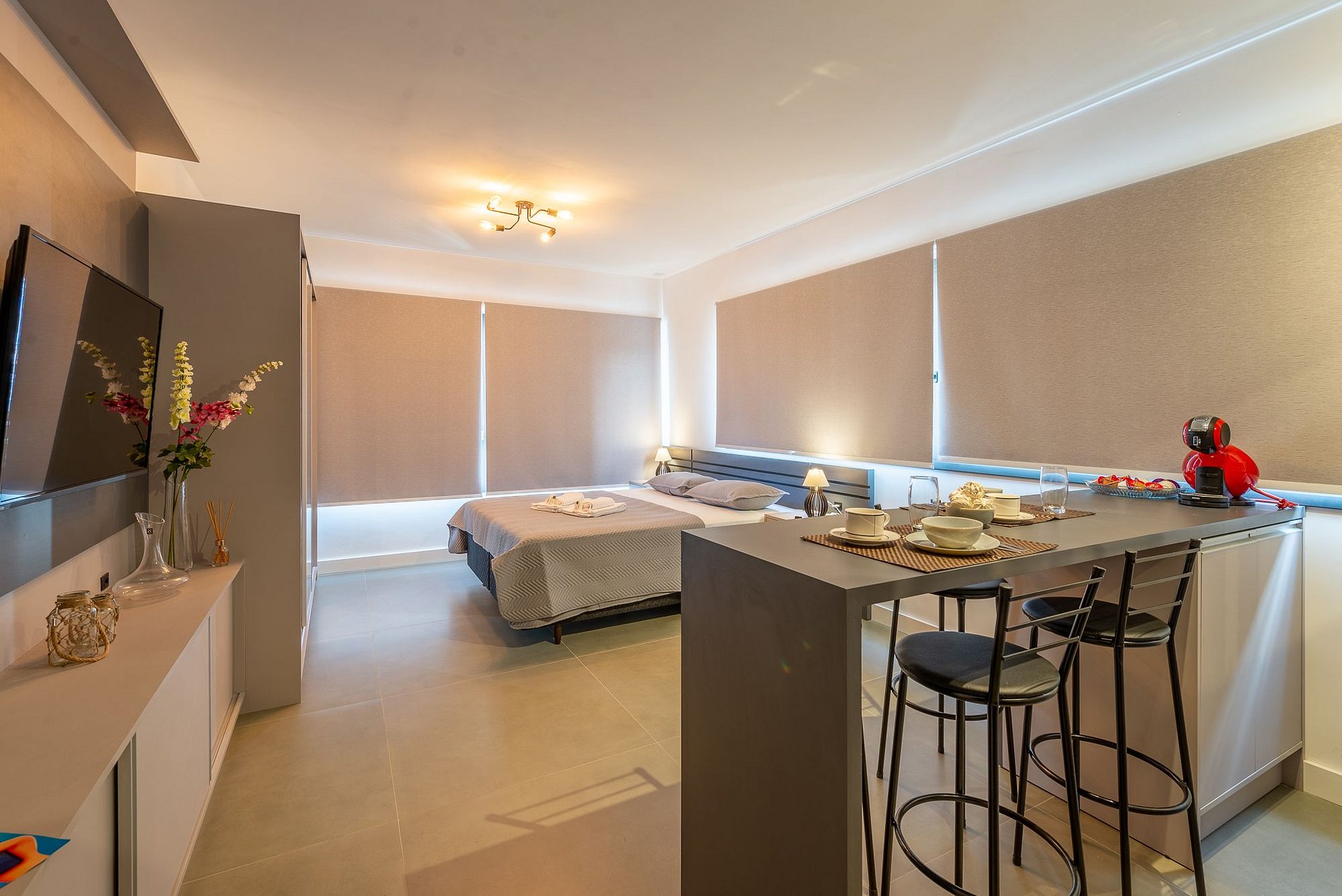 O imóvel é super aconchegante e muito funcional. Possui uma cama de casal, banheiro super bem iluminado com chuveiro excelente. O apartamento ainda conta com ar-condicionado (SPLIT), armários com cabides, SmartTV, WI-FI super rápido (ótimo para trabalhar), utensílios básicos de cozinha incluindo fogão de indução, grill, microondas, também conta com secador de cabelo, roupa de cama e banho e amenities (shampoo, condicionador e sabonete). O imóvel conta com um colchão inflável para a terceira pessoa. Imóvel com 1 vaga de garagem coberta. Junto a lavanderia fica o ferro de passar roupas.
