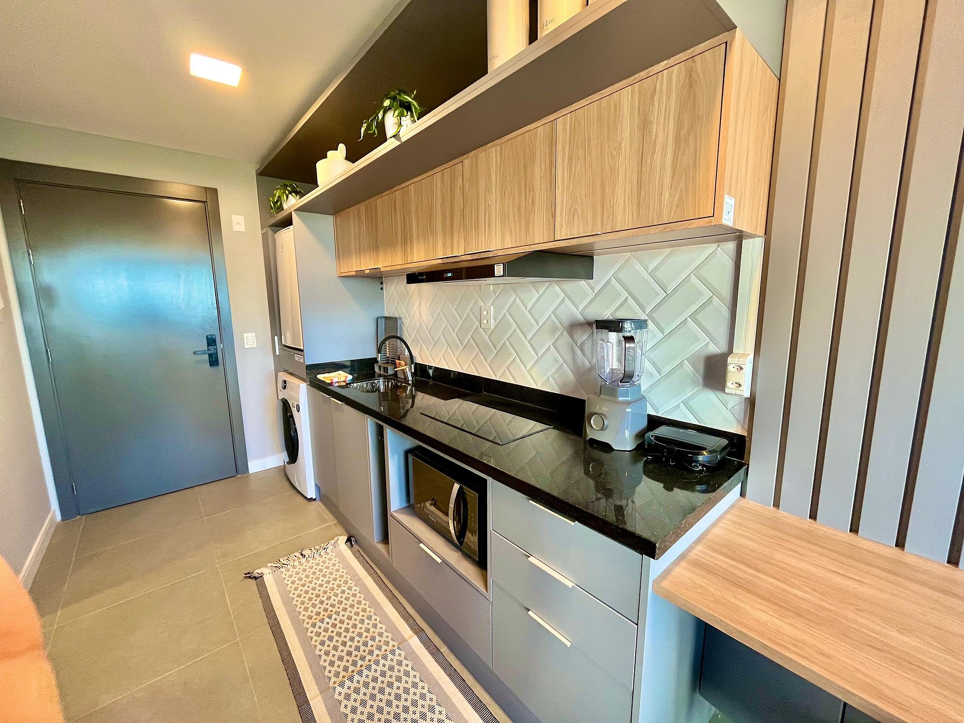 A cozinha dispõe de utensílios básicos e eletrodomésticos como cafeteira, chaleira elétrica, liquidufucador, torradeira, fogão de indução e micro-ondas. O apartamento também inclui roupas de cama e banho, secador de cabelo, ferro de passar roupas, amenities (shampoo, condicionador e sabonete) e itens adicionais como cobertores e travesseiros.